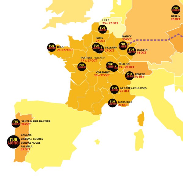 Este ano, a Artelier? – Teatro de Rua junta-se à PAR – Plataforma das Artes de Rua, ao FIAR – Centro de Artes de Rua de Palmela e à Bússola | Plataforma para o Desenvolvimento Artístico e Cultural, criando novos apoiantes para o movimento e potenciando, com isso, o incentivo ao acontecimento de apontamentos que marquem esta iniciativa em múltiplos pontos do país. Assim, no fim-de-semana de 27 e 28 de Outubro, Portugal volta a surgir no mapa “Rue Libre”. Lisboa, Palmela e Santa Maria da Feira são os locais para onde os convites à mobilização dos artistas e público estão dirigidos, permitindo a criação de apontamentos “Rue Libre”, adequados à realidade nacional.